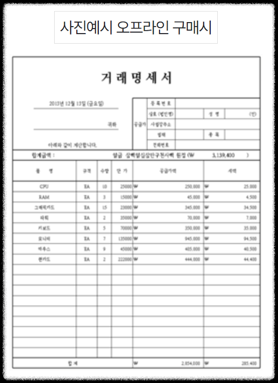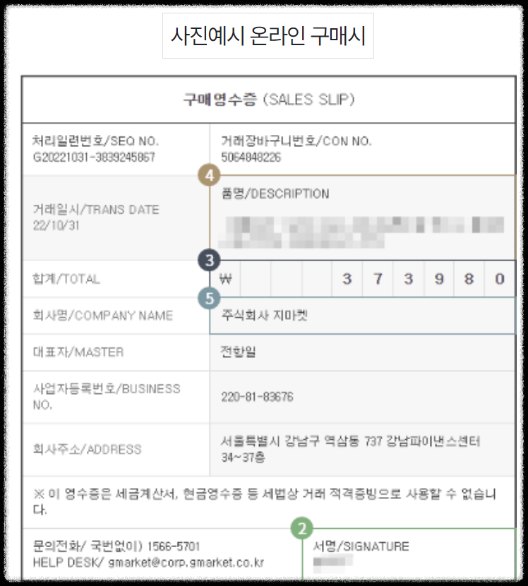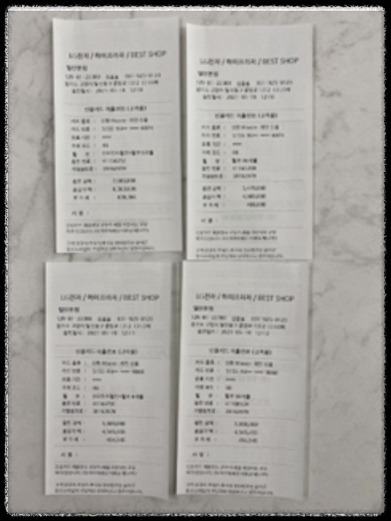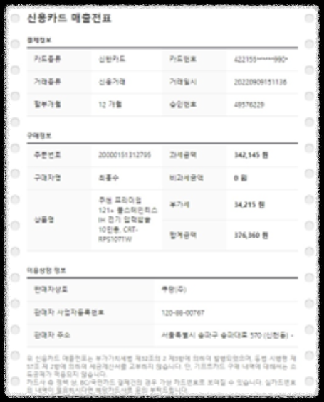 영수증 : 구매금액, 구매일시, 승인번호, 구매매장명(사업자번호 포함)