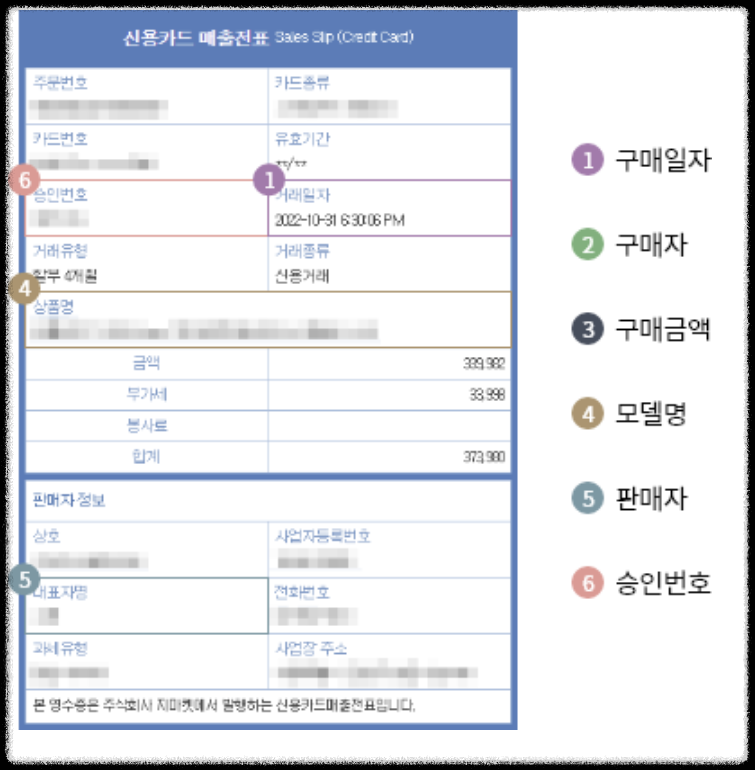 구매자 성명, 품목, 모델명, 구매금액, 구매일시, 구매매장명(사업자번호), 직인(서명)