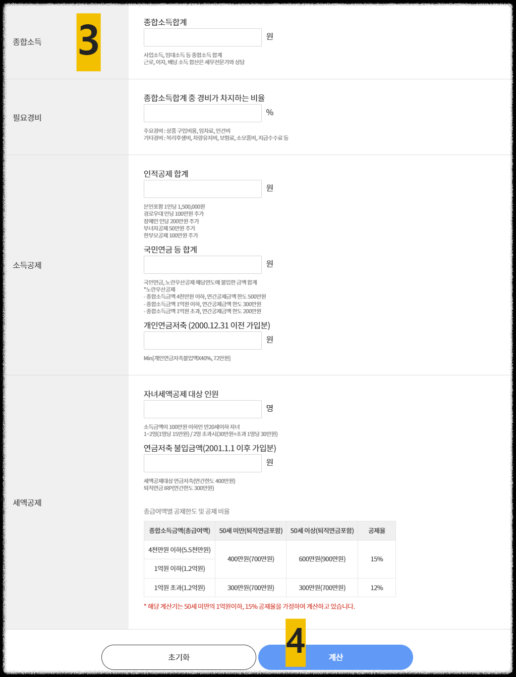 3) 종합소득. 필요경비. 소득공제. 세액공제란 입력