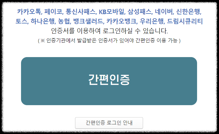 (카카오톡, 통신사PASS, 삼성패스, KB모바일인증서, 페이코,네이버, 뱅크샐러드 등 총 11종 민간전자서명 이용하여 로그인)